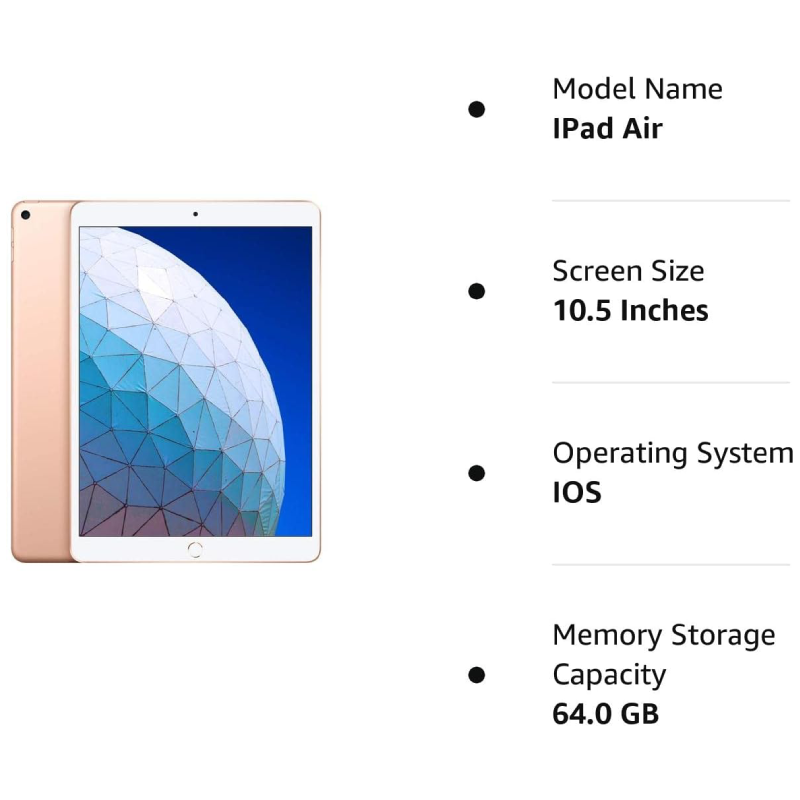 Apple iPad Air (2019) Wi-Fi is based on iOS 12 and packs 64GB of inbuilt storage. The Apple iPad Air (2019) Wi-Fi measures 250.60 x 174.10 x 6.10mm (height x width x thickness) and weighs 456.00 grams. It was launched in Silver, Space Grey, and Gold colours.